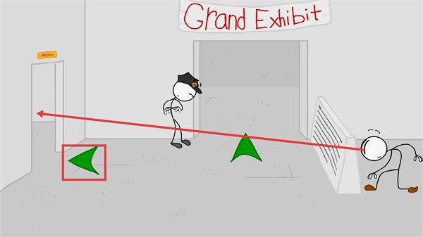 4、在展厅场景中,使用红色框标注的【绿色箭头道具】,该道具可指引方向或触发门的开启,借助它向左侧门推进,完成该环节关卡流程。
