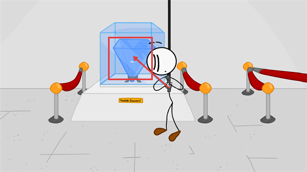3、目标为红色框标注的【TensionDiamond】,但需注意其展示柜周边存在隐藏机关,直接接近会触发危险,需提前用道具规避风险。