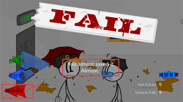 4、进入失败界面后,点击红色框标注的【回到开始】按钮重新挑战,本次需调整策略:先处理安保,再借助道具破门逃离。