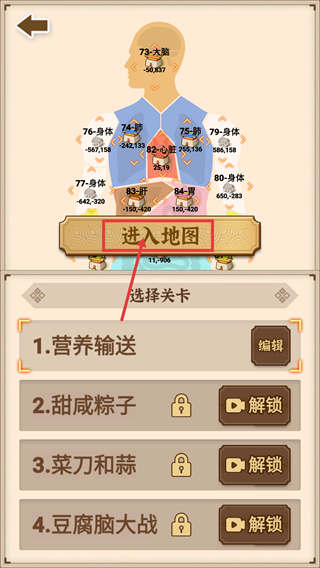 1、选择已解锁的【营养输送】关卡,点击【进入地图】进入对局,其余关卡可通过看广告解锁,按顺序推进更易积累资源。