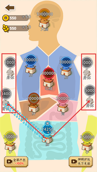 2、对局中先操控24250+50兵力的【肠】据点,攻占周边低兵力的【身体】据点,逐步整合兵力向高兵力的【心脏】等区域推进。