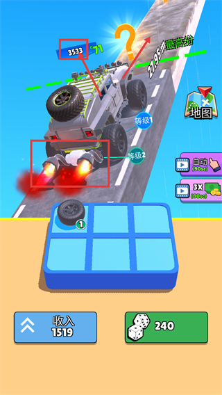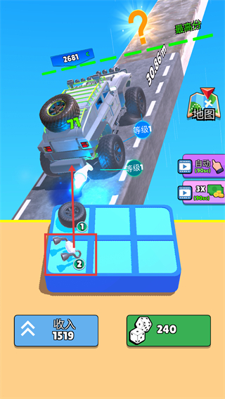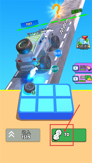 1、消耗70骰子获取部件,当前已有等级1轮胎,车辆等级1,需积累部件提升车辆属性,同时关注收入1519的收益进度。