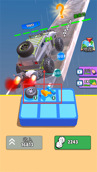 1、合并等级3的轮胎与部件,升级车辆对应模块至等级2,积分升至11451,收入同步提升至16813,高等级部件助力性能飞跃。