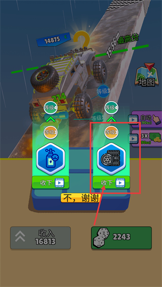3、通关后可选择收下等级4的部件,也可点击“不,谢谢”跳过,选择对应部件能快速提升车辆模块等级。