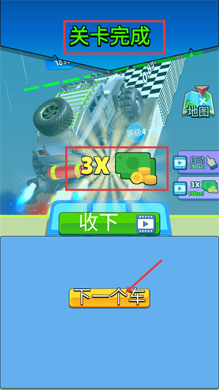 4、关卡完成后可领取3X金币奖励,点击“下一个车”进入新关卡,继续通过部件合并提升车辆性能。