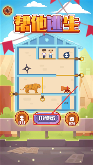 1、进入游戏后点击【开始游戏】,需观察场景内机关(如老虎、炸弹),通过控制拉环规避危险,帮助角色逃生。