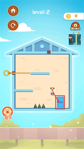 2、在【level-2】关卡中,先操作上方拉环调整路径,再处理下方障碍,为角色开辟通往【Exit】的安全路线。