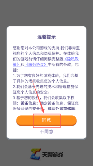 1、同意协议:首先打开温馨提示界面,阅读隐私政策与服务协议,点击“同意”进入主菜单。