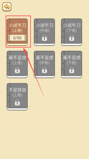 3、选择卷轴:在章节界面中,点击“小试牛刀(上卷)”进入答题关卡,查看进度0/50。