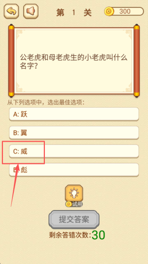 4、提交答案:阅读题目后点击“提交答案”,剩余答错次数30,完成挑战并继续下一题。