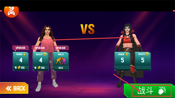 1、面对【POWER-5】【HEALTH-5】的对手,先消耗100货币通过【UPGRADE】提升自身属性,配置【SKILLS-DECK】后点击【战斗】。