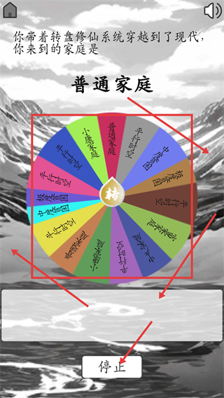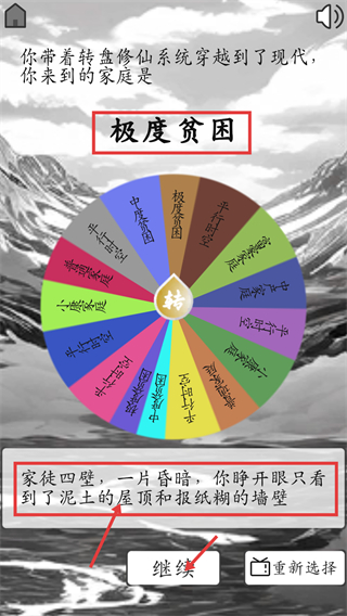 2、转盘随机机制暗藏逆袭玄机,出生背景、灵根资质、人生奇遇等关键节点随机生成,流民出身搭配上仙级灵根强度。