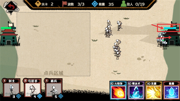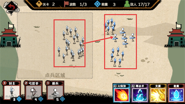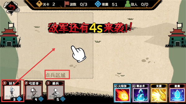 1、敌军来袭前,在【点兵区域】消耗能量召唤【剑士】,优先部署前排单位构建初始防线。