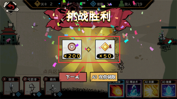 4、通关后领取【200】货币与【50】钻石奖励,点击【下一关】继续挑战,积累资源解锁更多兵种。