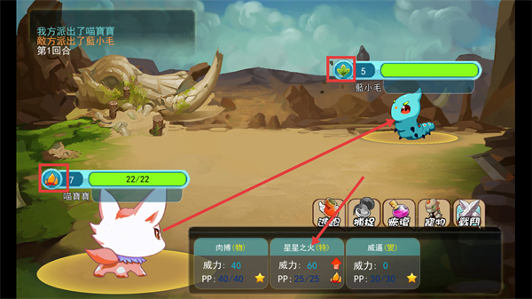 2、对战中我方出【喵宝宝】、敌方出【怪小毛】时,优先用【星星之火】技能(威力-60),注意技能【PP】值剩余量。