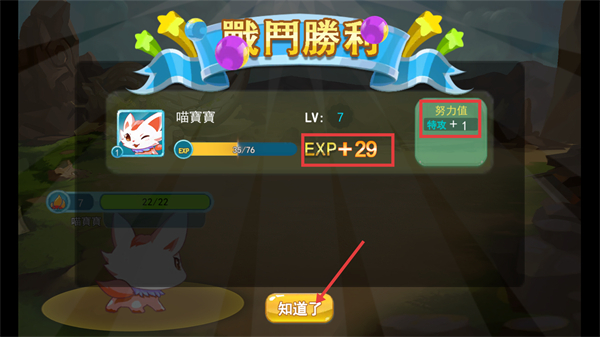 3、战斗胜利后,【喵宝宝】可获得【EXP+29】与【努力值+1】,点击【知道了】关闭界面继续游戏。