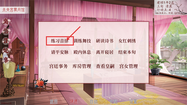 2、进入【未央宫霁月馆】场景后,可消耗【行动点:4】选择【练习音律】等行为,提升对应技能属性以推进剧情。