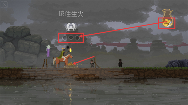 1、按提示【按住生火】,同时利用金币袋里的金币建造大本营,完成对应交互以推进流程。
