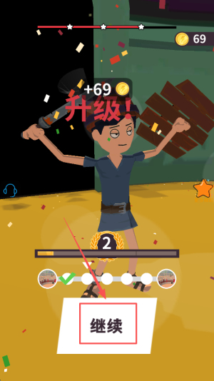 4、完成升级:当界面显示69+69时,点击“升级”提升威力,再点“继续”进入下一关挑战。