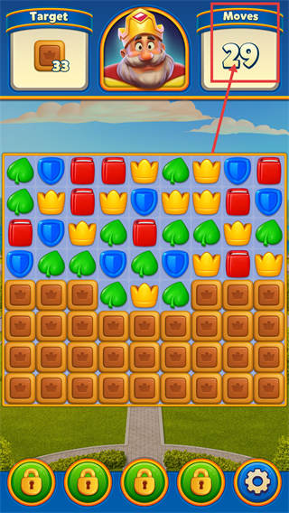 1、关卡目标是收集【33-皇冠方块】,当前剩余【29-步数】,优先消除皇冠方块所在区域的元素以推进进度。