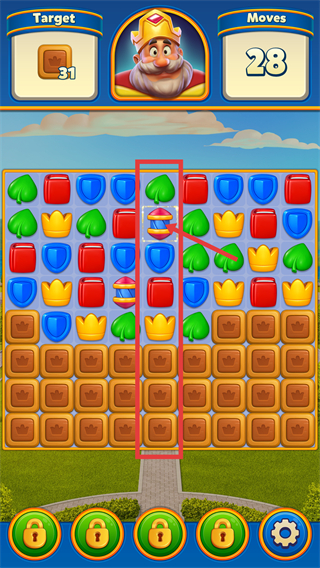 2、合成【竖列特效道具】后,使用它可消除整列元素,快速减少下方皇冠方块的遮挡障碍。