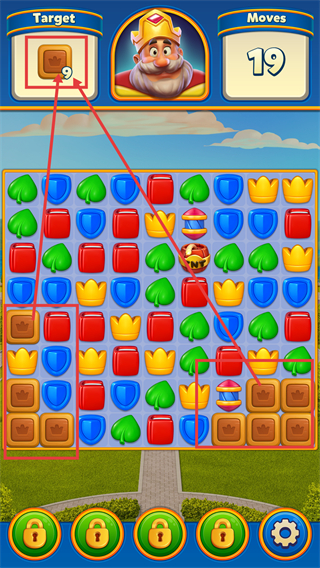 3、当【皇冠方块】数量剩余【9】时,聚焦其所在区域的消除操作,利用特效道具加速收集。