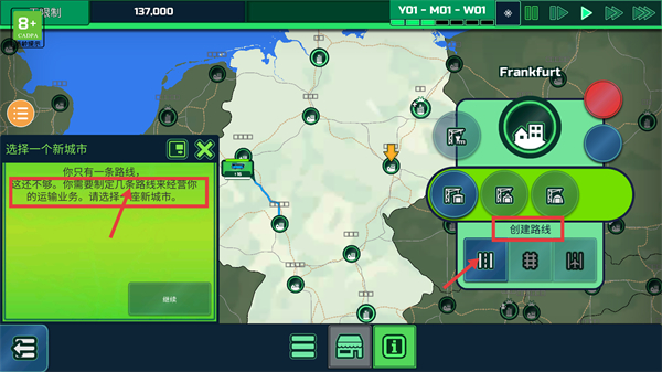2、当提示“选择一个新城市”时,点击【创建线】功能,选择新城市来拓展运输业务,推进关卡进度。