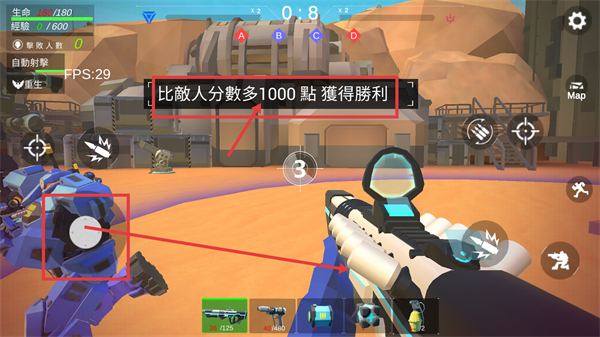 2、游戏胜利条件是【比敌人分数多1000点-获得胜利】,通过移动按键调整位置,用武器射击敌方积累分数。