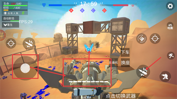 2、乘坐载具后,可通过移动按键操控载具移动,同时点击武器按钮使用载具武器,增强作战能力。