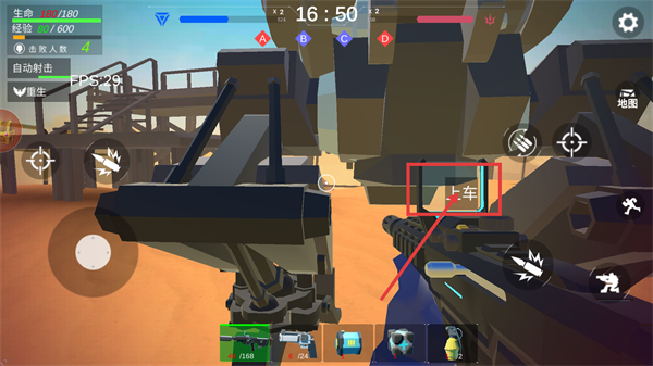 1、靠近载具时点击【上车】可乘坐载具,借助载具提升移动效率与战场机动性,便于快速转移。