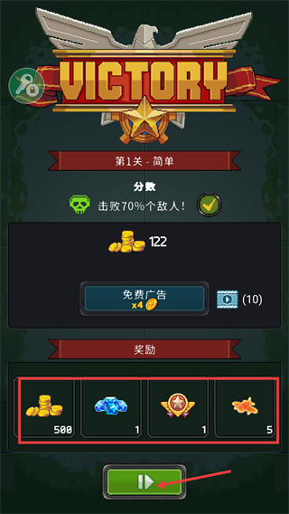 4、通关【第1关-简单】后可获得【500】金币、【1】钻石等奖励,点击按钮可进入下一关继续挑战。