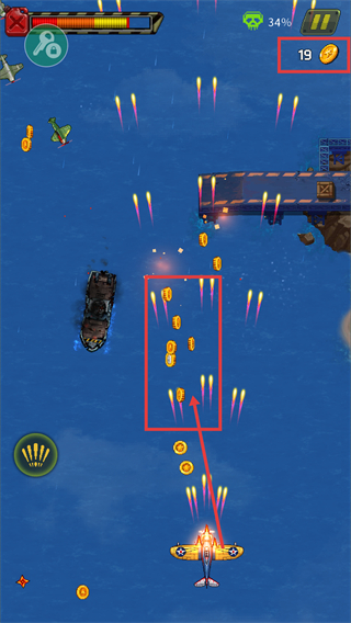 3、战斗过程中收集场景内的金币,金币数量会实时更新,积累的金币可用于后续升级战机或解锁科技。