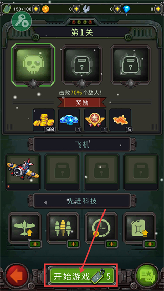 1、在【第1关】界面消耗【5】道具点击【开始游戏】进入关卡,可先查看【先进科技】模块提升战机能力。