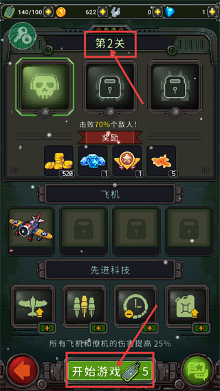 1、进入【第2关】界面,消耗【5】道具点击【开始游戏】前,可升级【先进科技】提升战机伤害,助力通关。
