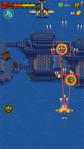 3、战斗时拾取场景中的道具,如磁铁类道具可辅助收集资源,增益类道具能强化战机能力,提升作战效率。