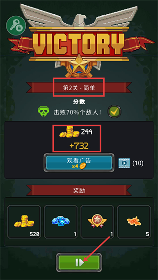 4、通关【第2关-简单】后获得【520】金币等奖励,分数累计至【244】并额外获得【+732】,点击按钮进入下一关。