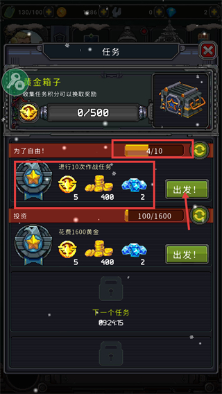1、在任务界面点击【出发!】完成【为了自由!】任务,可获取【5】积分、【400】金币等奖励,积累积分还能兑换【黄金箱子】。