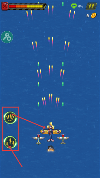 2、战斗时利用左侧技能按钮,召唤僚机或释放特殊技能,辅助躲避弹幕并提升输出能力,快速推进关卡进度。