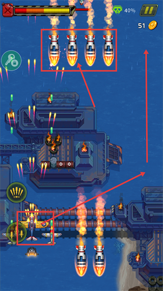 3、面对敌方导弹集群时,操控战机灵活走位躲避,同时集中火力摧毁导弹发射装置,降低战场威胁。