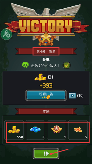 4、通关【第4关-简单】后获得【550】金币、【2】钻石等奖励,分数累计【131】并额外+393,点击按钮进入下一关。