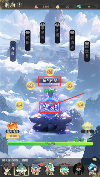 1、在【洞府】界面中,点击【突破】可提升【炼气四层】境界,突破前可利用【顺月丹】类道具助力,注意突破冷却时间。