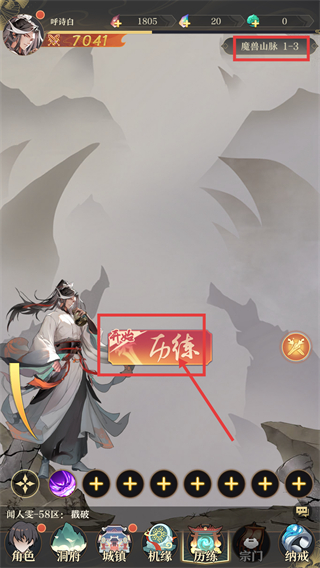 2、进入【历练】界面后,选择对应关卡(如【魔骨山脉-1-3】),点击【历练】按钮开启挑战,可积累修为与资源。