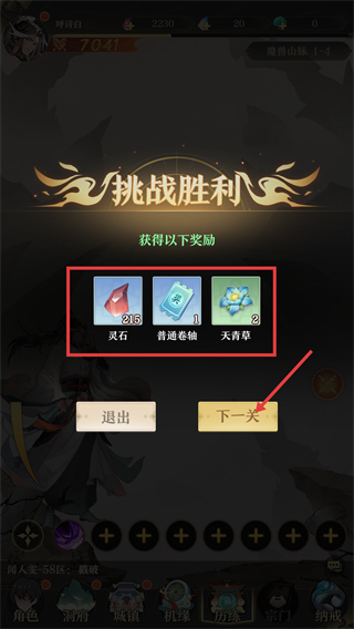 4、挑战胜利后,可获得【灵石】【普通卷轴】【天青草】等奖励,点击【下一关】可继续历练积累更多资源。