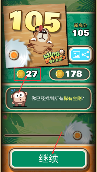 4、结算时获得【27】金币与新高分后,点击【继续】按钮可开启下一轮弹射,尝试收集更多稀有角色。