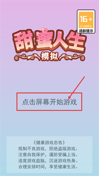 1、进入【甜蜜人生-模拟】时,先确认【16+-CADPA适龄提示】,再点击【点击屏幕开始游戏】进入游玩。