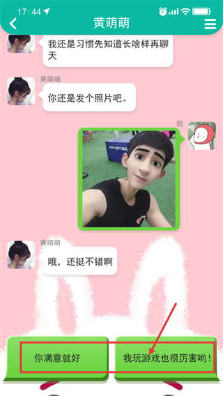 2、聊天交互中,选择【你满意就好】类回复可契合对话节奏,同时可适时展示自身优势如【我玩游戏也很厉害哟!】。