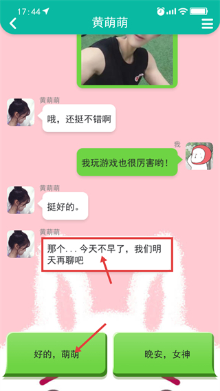 3、当对方提出【那个...今天不早了,我们明天再聊吧】时,选择【好的,萌萌】类礼貌回复能提升互动好感。