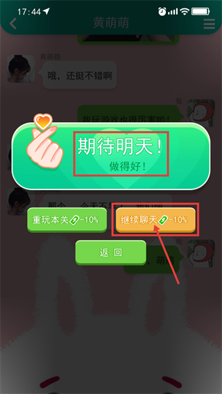 4、互动结束后,点击【继续聊天-+10%】可推进好感进度,同时留意【期待明天!-做得好!】的反馈提示。