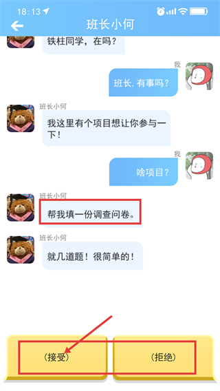 2、面对【帮我填一份调查问卷】的委托,选择【接受】可开启任务流程,拒绝则会中断此次互动。