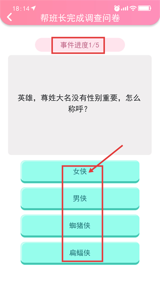 3、参与调查问卷时,事件进度为【1/5】,需从【女侠-男侠-蜘猪侠-蝙蝠侠】中选择选项推进流程。